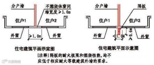 6.2.5 ……住宅建筑外墙上相邻户开口之间的墙体宽度不应小于1.0m;小于1.0m 时,应在开口之间设置突出外墙不小于0.6m 的隔板。