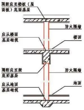 6.2.4 建筑内的防火隔墙应从楼地面基层隔断至梁、楼板或屋面板的底面基层。住宅分户墙和单元之间的墙应隔断至梁、楼板或屋面板的底面基层,屋面板的的耐火极限不应低于0.50h。