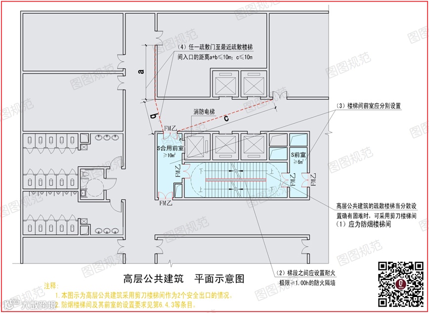 5.5.10 高层公共建筑的疏散楼梯,当分散设置确有困难且从任一疏散门至最近疏散楼梯间入口的距离不大于10m时,可采用剪刀楼梯间,但应符合下列规定: