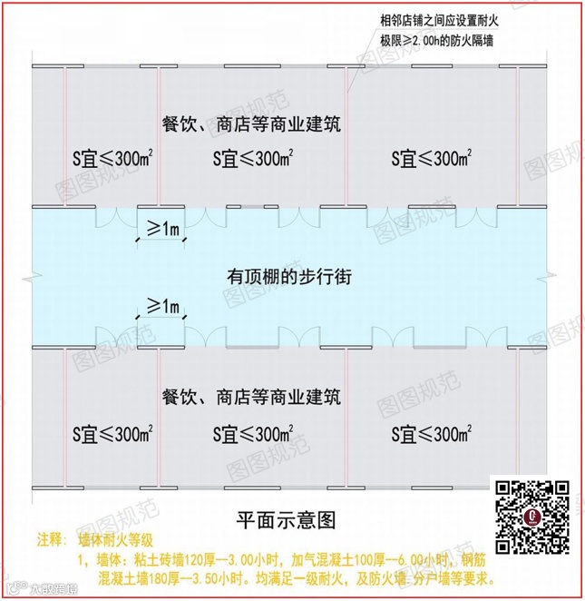 5.3.6-3 步行街两侧建筑的商铺之间应设置耐火极限不低于2.00h的防火隔墙,每间商铺的建筑面积不宜大于300㎡。(建筑设计防火规范)