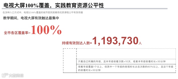 “空中课堂”为保证教学效果和保护学生用眼健康,建议“大屏为主、网络为辅”,因此相较于全国其他地区,上海空中课堂以大屏为主的特色优势凸显,这也是上海市教委在吸取全国其他地区经验、综合评估用户需求的基础上的一次创新举措。在所有入口中,电视大屏对上海城市居民100%的覆盖率有效实践了教育公平。