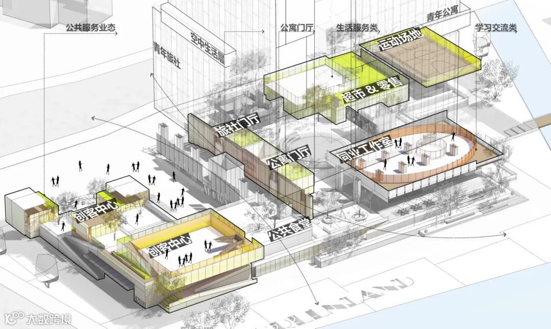 结合调研结果,我们提出设计一座兼具城市开放性与居住私密性的公寓建筑,同时结合北仑地区的人才引进目标,提供一处集居住、休闲、娱乐、自我提升、轻度办公等多样业态于一体“青年广场”。这里就犹如一部立体的当代青年生活图鉴一般,每天上演着青年人生活、工作、交流、玩乐等各色各异的场景。