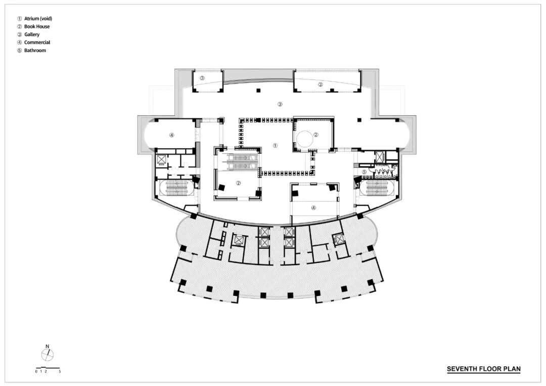 Bookshelves as Facade. I used a 10,000-meter-long bookshelf to construct the façade of this city. Losing the underground floor also meant losing the original library. Despite the addition of new evacuation stairs, bathrooms, and utility rooms, while ensuring the bookstore and commercial areas, it was not feasible to provide a library on the upper floors. Therefore, I decided to let the books go on shelves. Floors 2-6 house the reading area, the 1st and 7th floors serve as storage areas, and the 8th floor is dedicated to storage and cover displays. The tall bookshelves in the two atriums serve as showcases. These continuous bookshelves not only accommodate more than 470,000 books, exceeding the library's specified capacity of 400,000 but also form a continuous façade of books along the street in front of the bookstore. During the media opening day before the bookstore's opening, a journalist told me that the uninterrupted book display made her feel like a fish swimming in the ocean. I enclosed 16 'houses within houses' with bookshelves, hiding offices, a comedy theater, writer's studios, wellness classrooms, an art gallery, and a café. After passing through the bookshelves on both sides, there are facilities such as fast food, tea houses, galleries, cafes, an art furniture store, a gift shop, a stationery store, elevators, toilets, and evacuation stairwells. I have no fear of commerce, and my requirements for shop owners are akin to those established in ancient cities – they must respect the continuous façade of books in my city. This ensures that different businesses are embedded in my city. This is what it means to build a city with books.