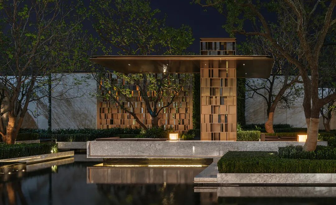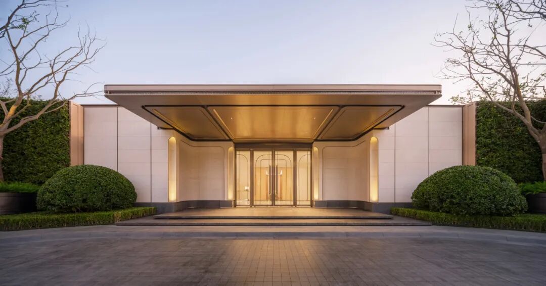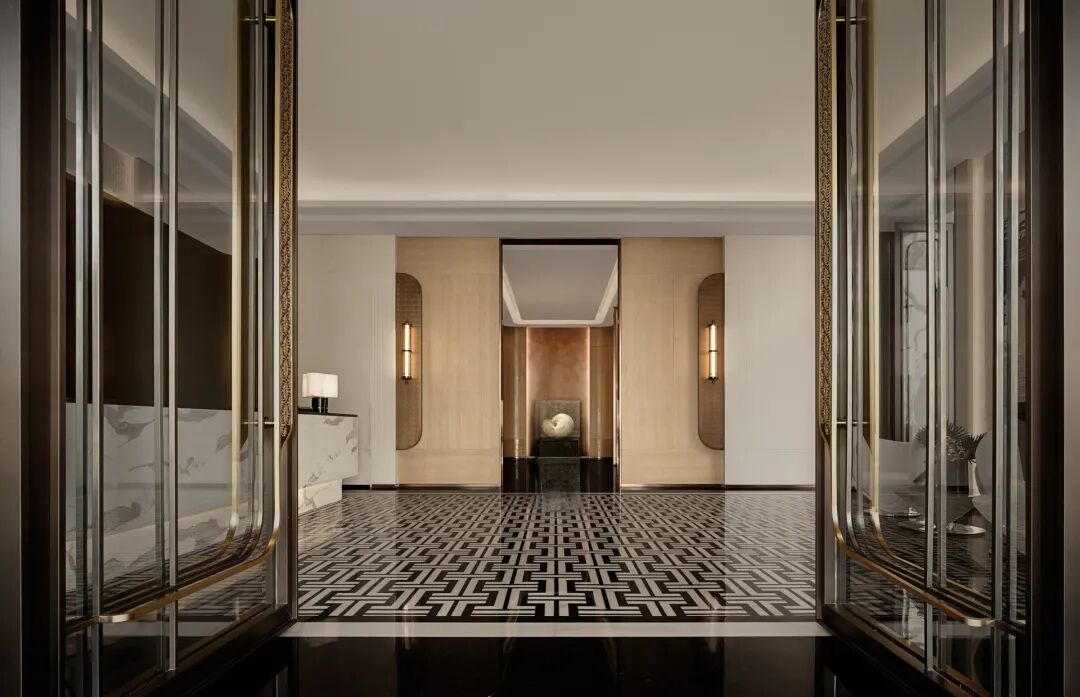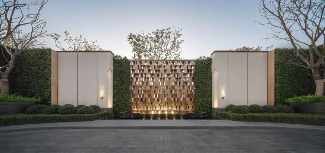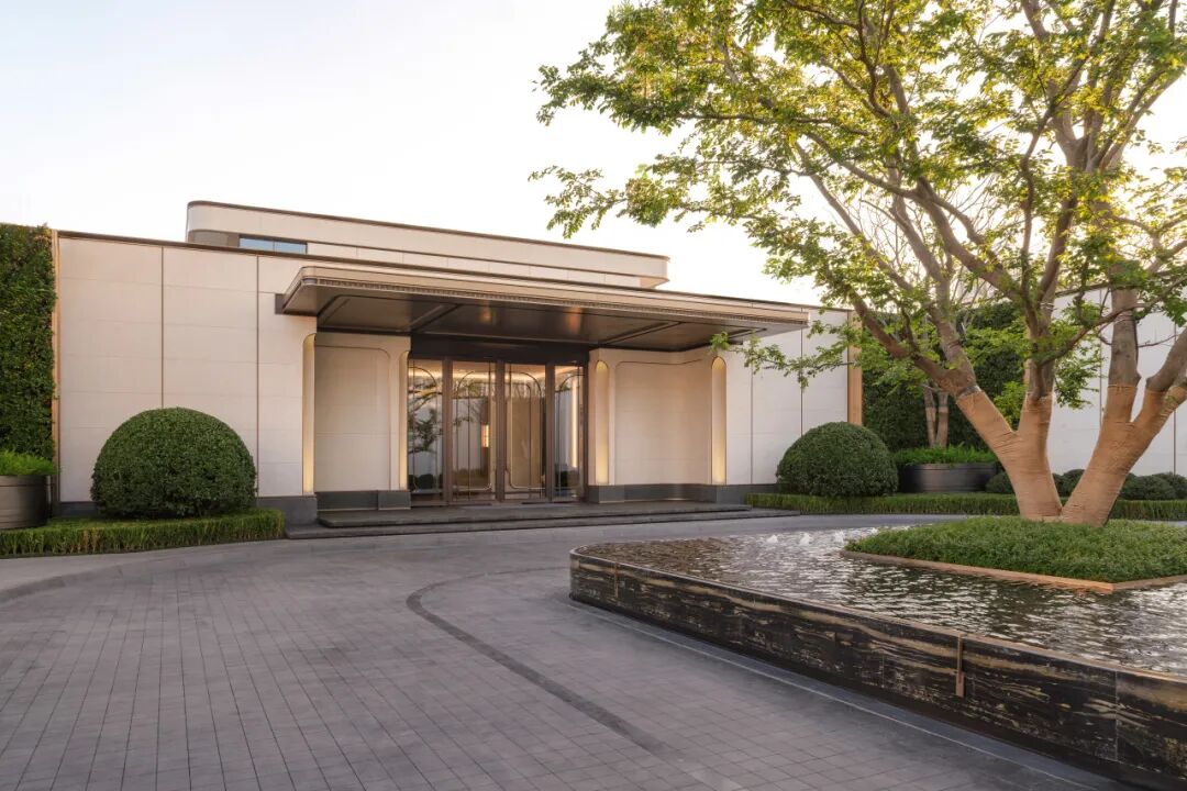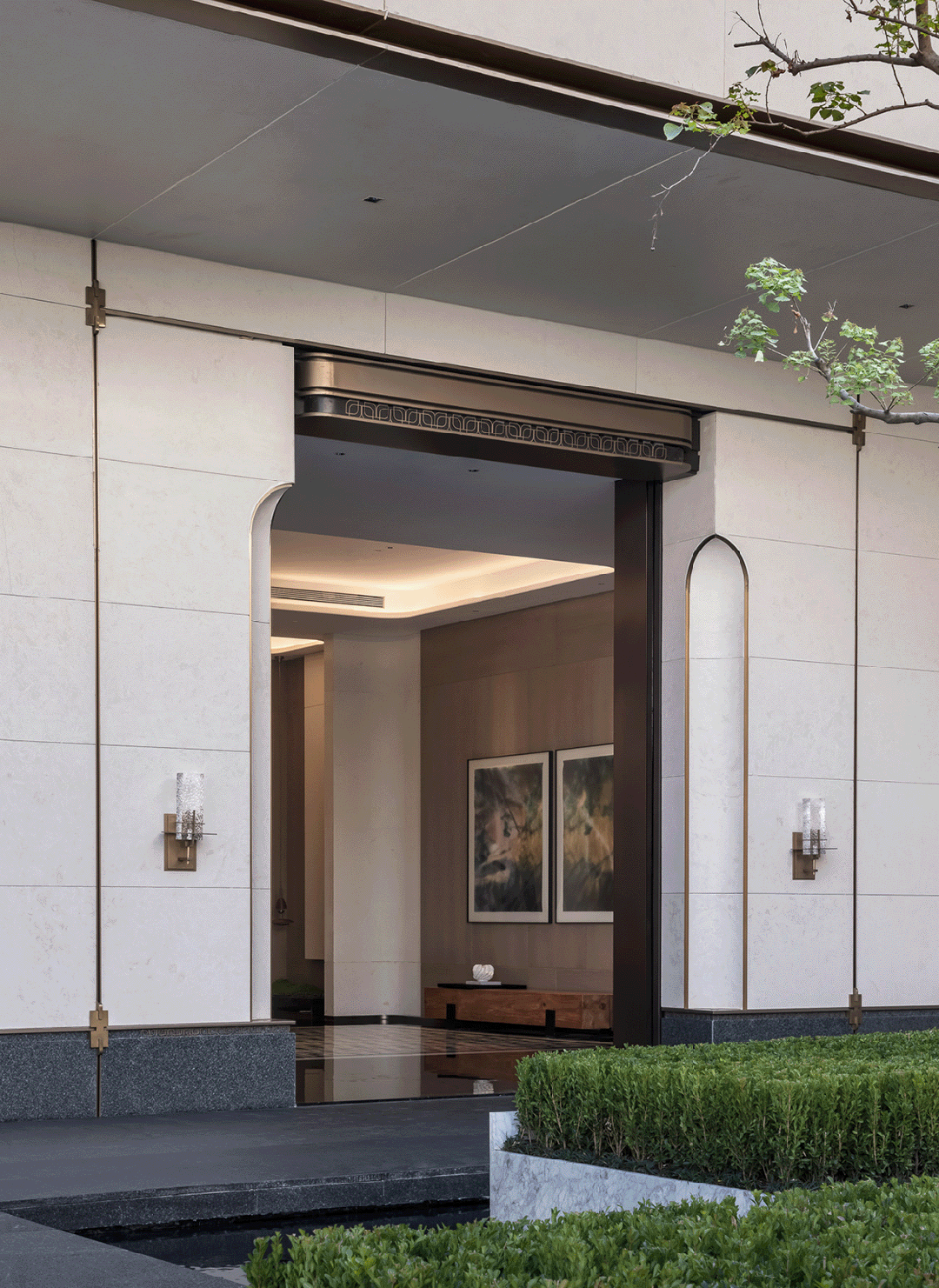 回转庭院构成的酒店式落客区,以浅色石材为底色,搭配香槟金、深咖色、灰黑色,呈现质感归家。挑高约6米的入口大堂则借鉴了安缦酒店入口的色彩,细节之中皆呈现奢华的品质。