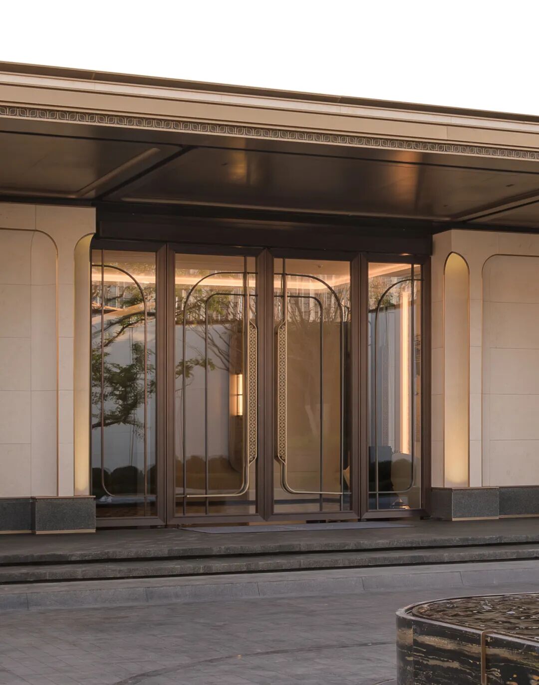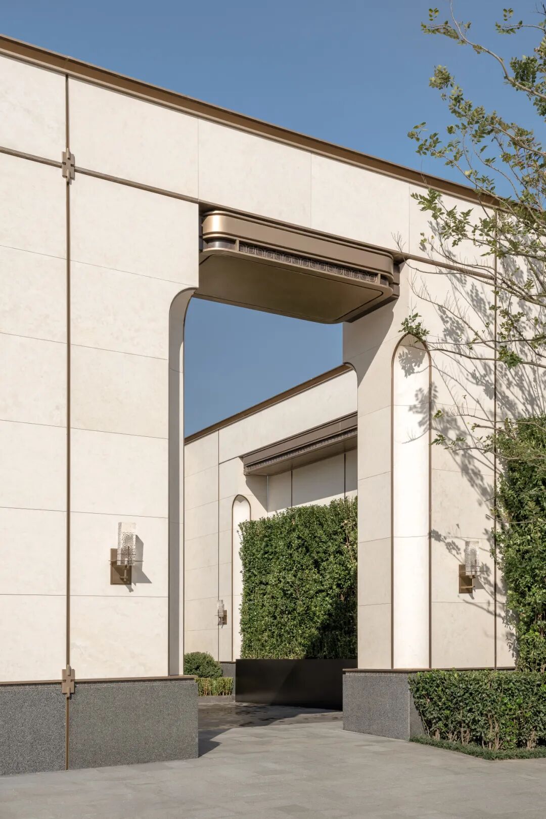 双扇4米高、1.5米宽电动平开门以酒店化弧形内凹形式呈现,宽3米顶部激光雕刻悬挑雨棚,分寸之间皆感受到奢华品质。