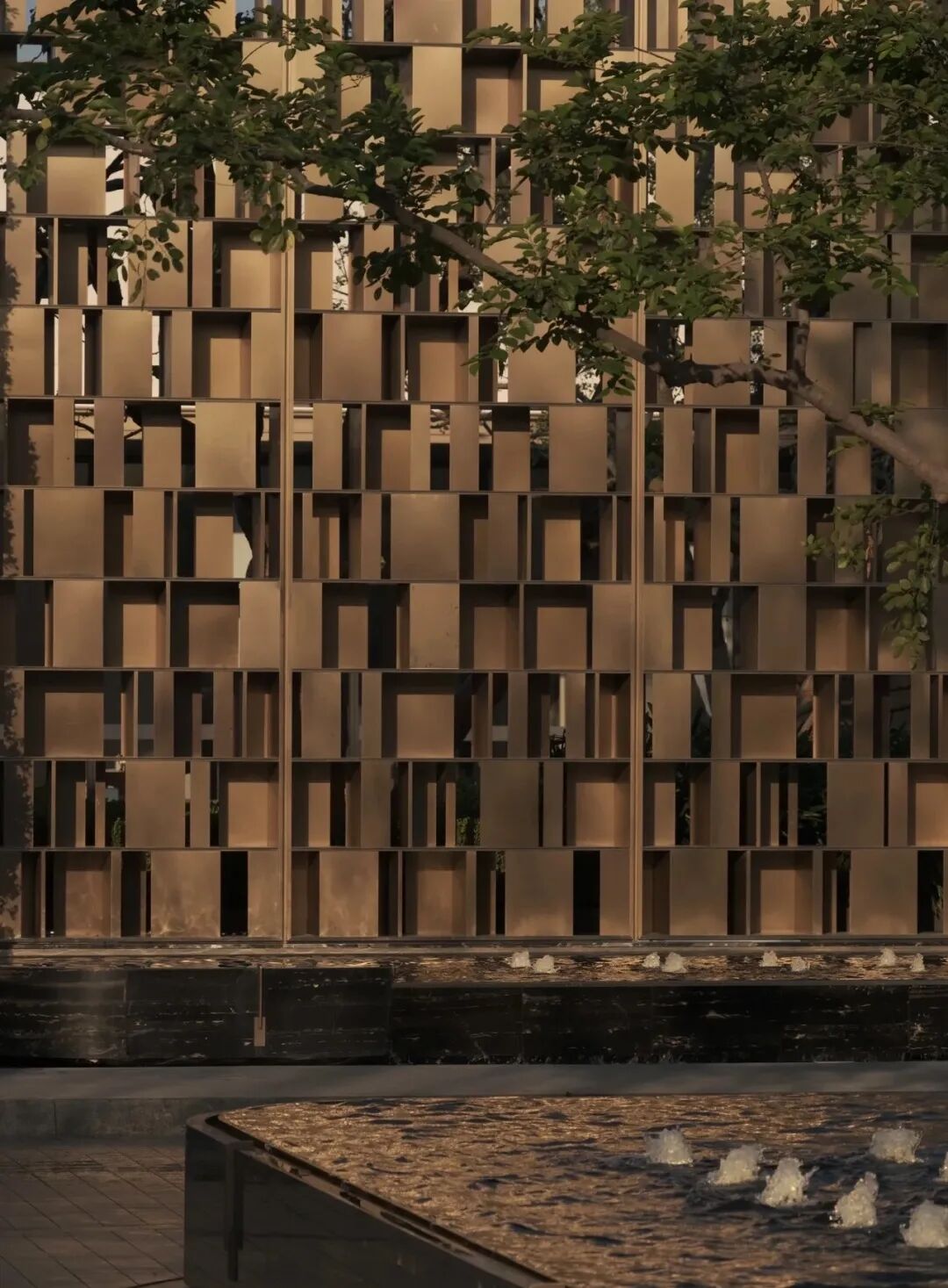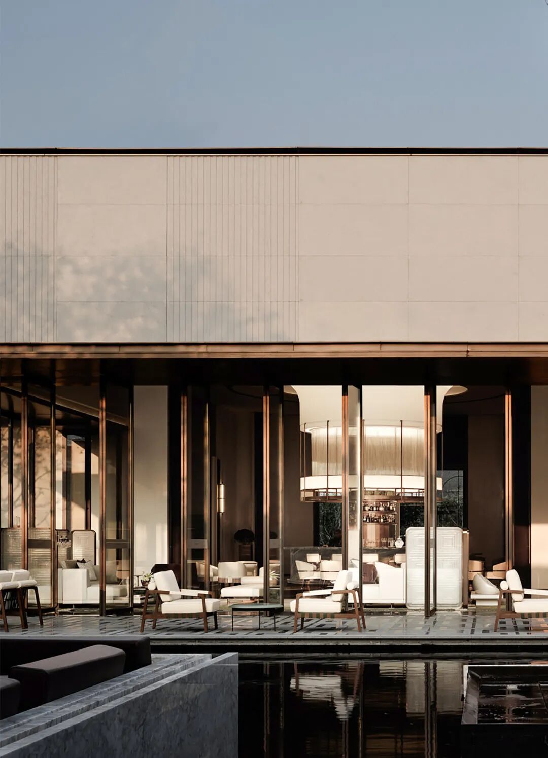 水院中的滨水鎏金,以顶部30cm斜切香槟金铝板面加精致金属肋条绘就,整体大面落地窗,形成一座座云瀑之幕。