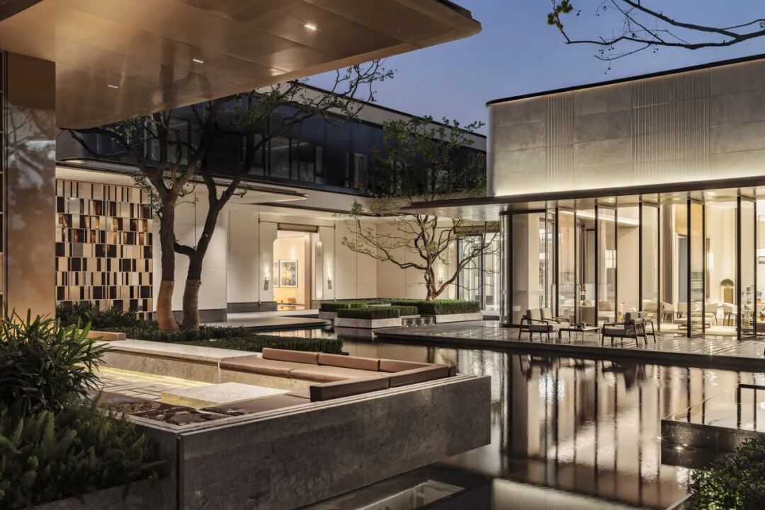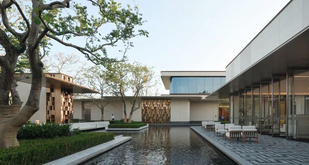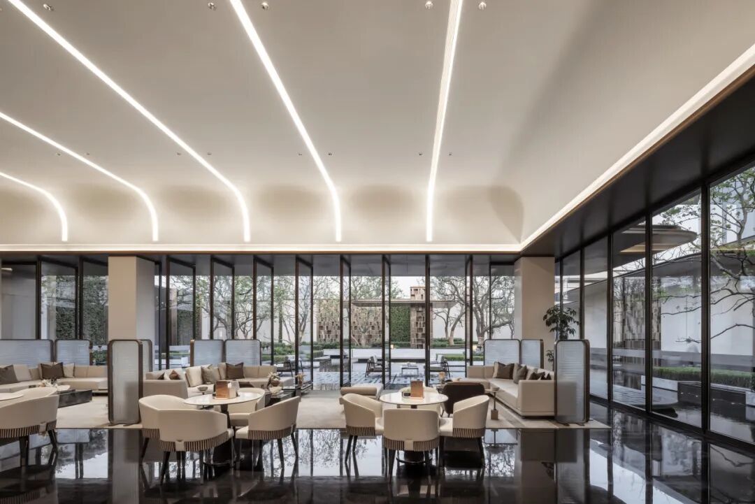 步入园区之后扑面而来的是度假感,水院围合出的一方天地让繁华与宁静在此转身,浓荫下是盈润流水,拂拭城市的喧嚣,让回家的心情在这里转换。“ 院落式景观、水院、树池、与矮景墙穿插,艺术水院、林下书吧、秘境花园 ”等场景打破建筑与室外的边界,室内外有机渗透,塑造层层递进的舒缓场景。