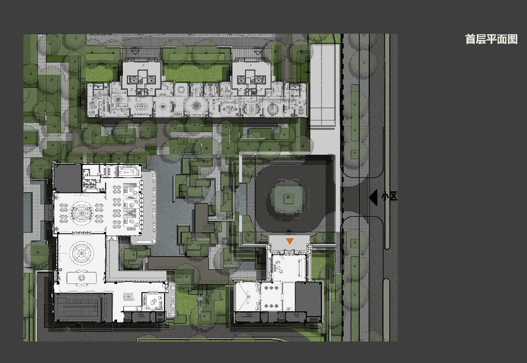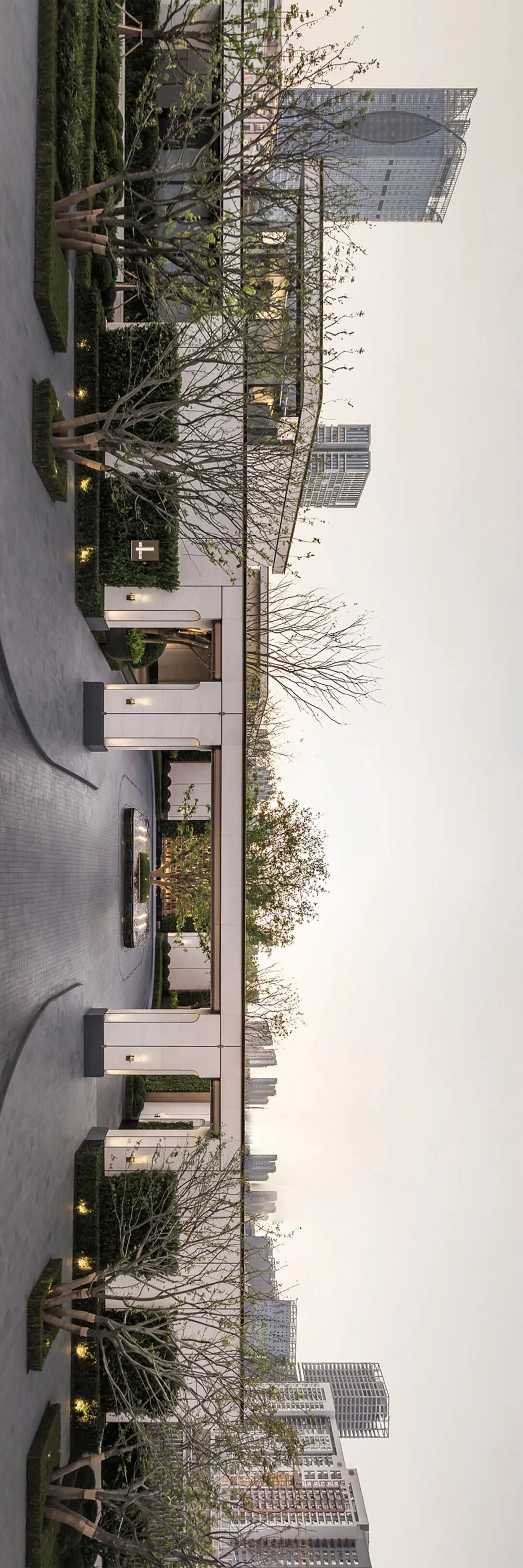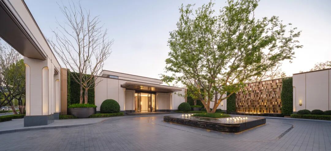 入口酒店式落客区以四周高6米回转落客庭院为方形的矩,以中央绿植水景为规,在循序渐进中点亮生活的诗意。
