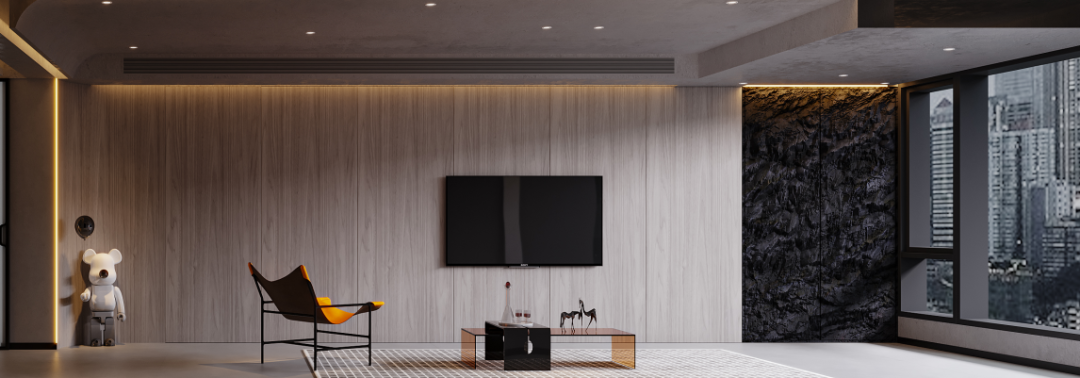 将空调外机处用pu石皮做了点缀性价比很高,与木饰面配合,让背景墙显得不那么无趣,墙面艺术漆的质感更立体简洁,营造了一种偏侘寂的空间感。