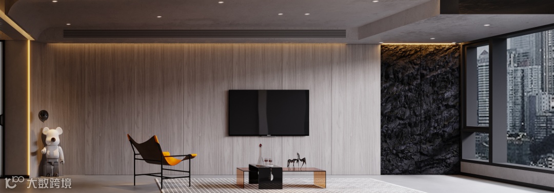 深沉而不平整的饰面元素糅合着灯光,视觉高级而具艺术美感,让空间既有自然的随性,又拥有大宅的气度格调。