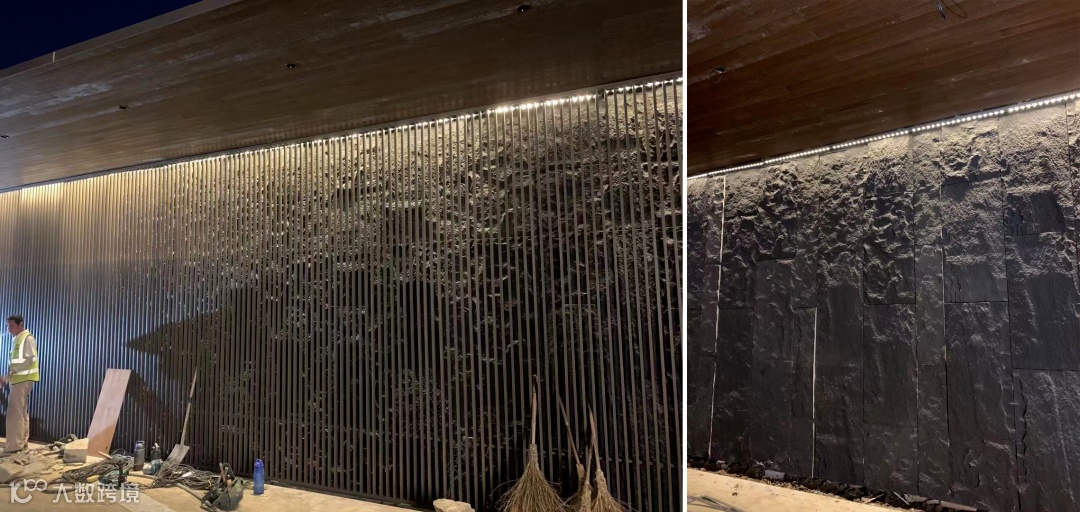 对界面以细密的格栅进行排列,背部衬仿自然面防水PU石。在格栅与PU石之间留出空隙打光处理,输出更简约的视觉装饰与更霸气的触觉表达。