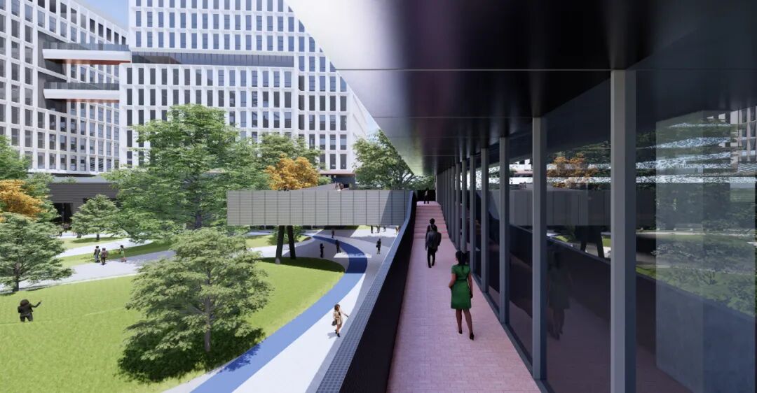 六栋高层研发楼和一栋多层配套服务楼根据地块特点,采用了可分可合的布局模式以应对变化的需求。每个研发单体都有自己独立的交通核,并通过两种方式进入。一种是从地面经由外围车行环道进入,满足工作时的高效运转。另一种是从二层共享平台进入。平台围绕中央庭院展开,打通了每栋楼的二层人行入口,并与配套楼相连