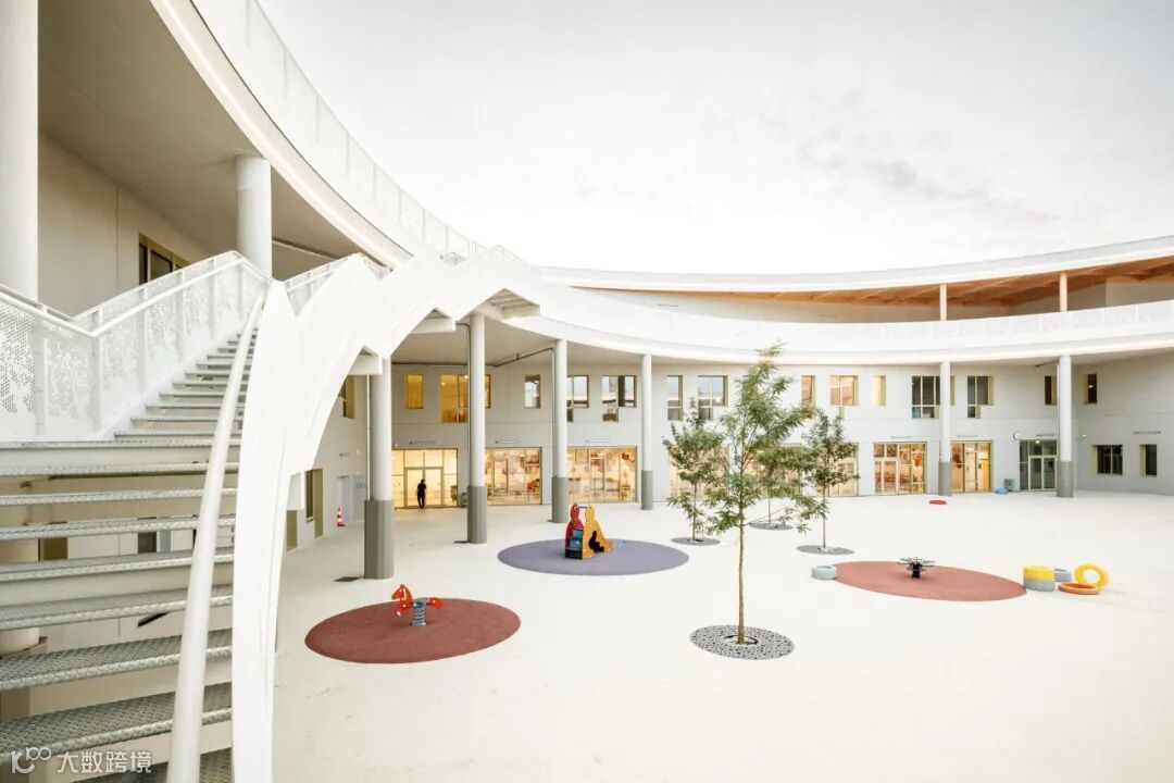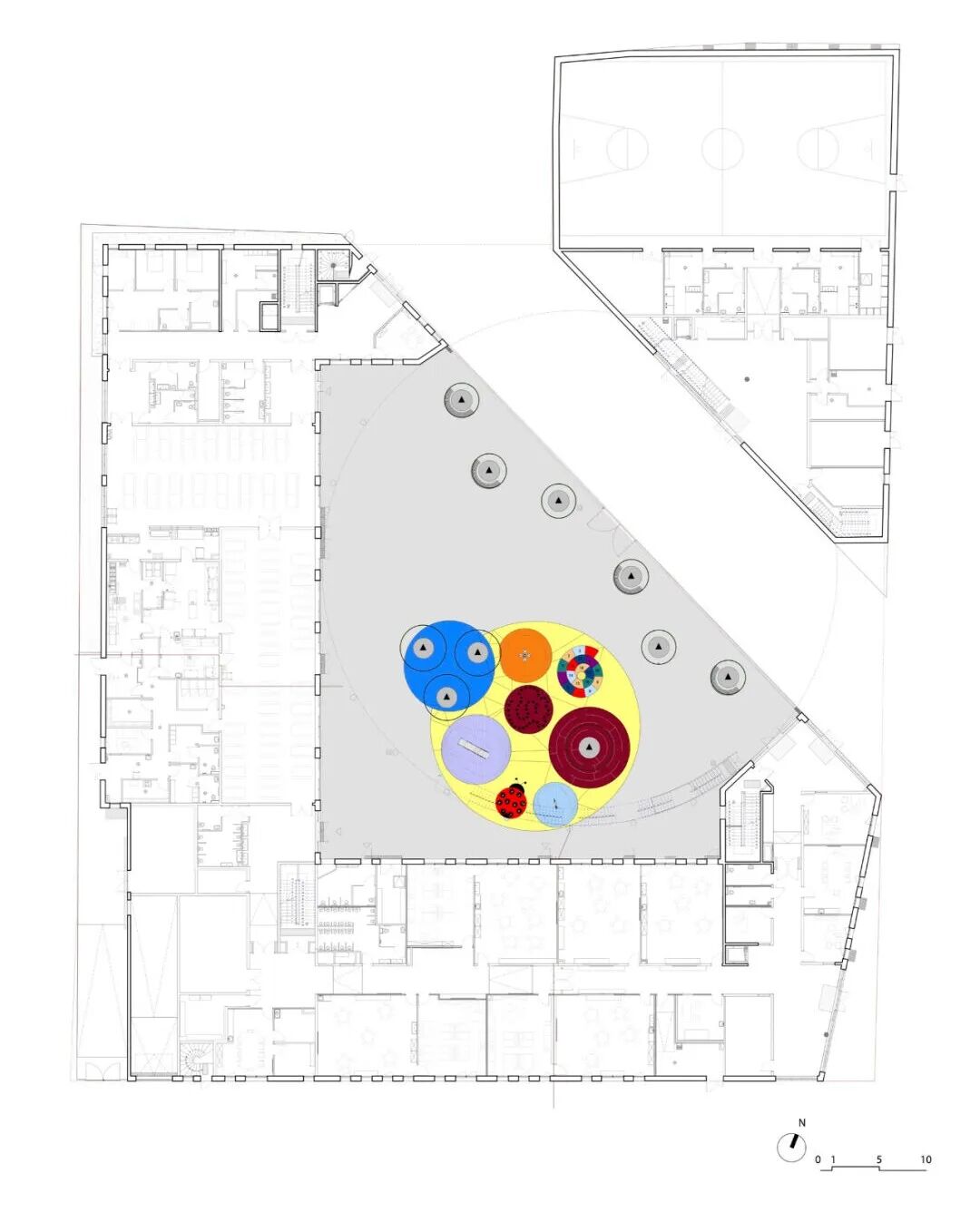 At the heart of an urban redevelopment program, the facility is developed in a circular pattern. The extension of the ground floor terrace, in harmony with the curves of the building, provides a high-level recreational area and a natural separation between the elementary and nursery schools. The interplay of these rounded shapes has made it possible to create areas of roofing with light vegetation, offering residents an attractive view of this fifth facade.