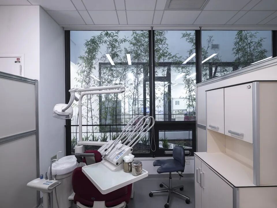 上海市徐汇区牙科医院建筑立面采用了生态化的立面系统,双层Low-E玻璃为室内基本的防水保温提供保障,铝制玻璃框料和冲孔铝板表皮相得益彰。