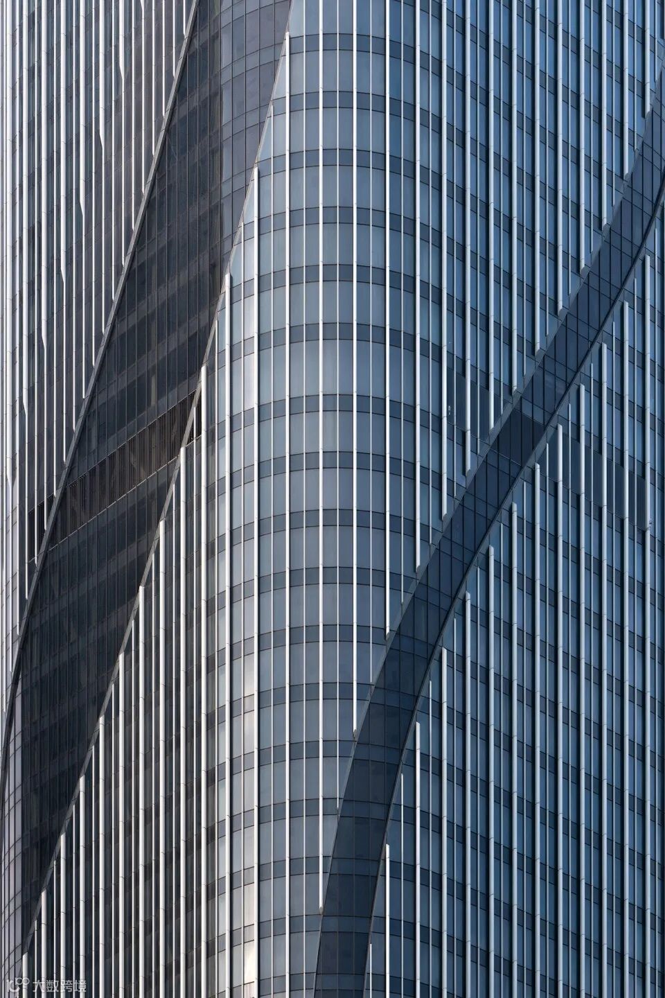 杭州世茂智慧之门超高层城市综合体通过对塔楼外立面表皮进行竖向线条的精细处理,整体包裹超白玻璃幕墙,配以铝构件线条勾勒缝隙。