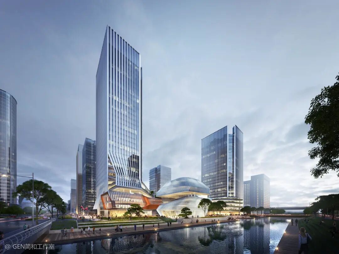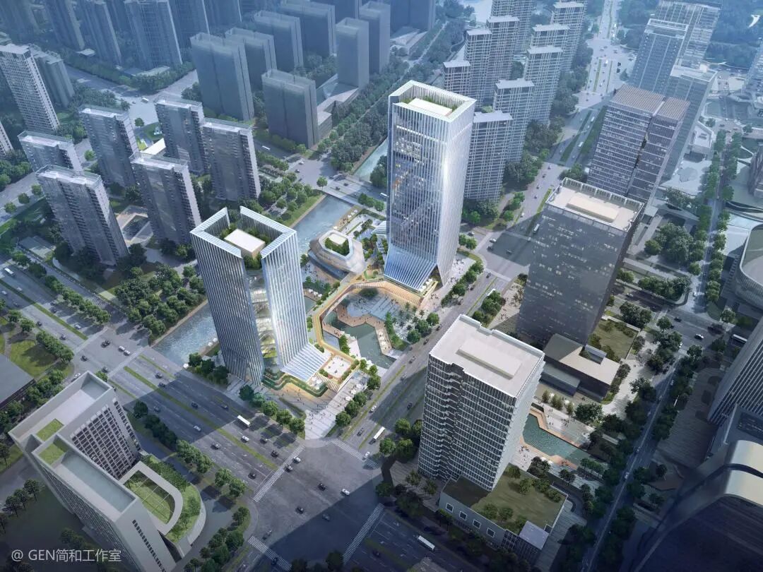 将地块的商业功能,人行交往拉结起来之后,设计转为思考建筑外形的属性。首先设计中为避免与其他地块同质化,采用了更开放的方式来处理滨水建筑界面,做了内街式的商业界面划分。水街景观元素穿插在建筑首层空间中。同时廊桥的存在,使得三层以上的开放式裙房屋顶花园与场地景观融合在一起。打造出建筑、绿化、景观、水系无界的空间体验,强化了城市节点。