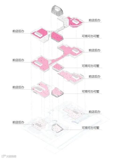 为了强化水街收头的效果,结合景观处理与功能定位。设计考虑将南侧地块的商业裙房一分为二,廊桥从中间穿过。从塔楼独立出来的裙房作为一个景观元素考虑,设计为水边的一个商业展示中心和创意办公孵化器,独具雕塑感与昭示性。