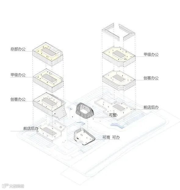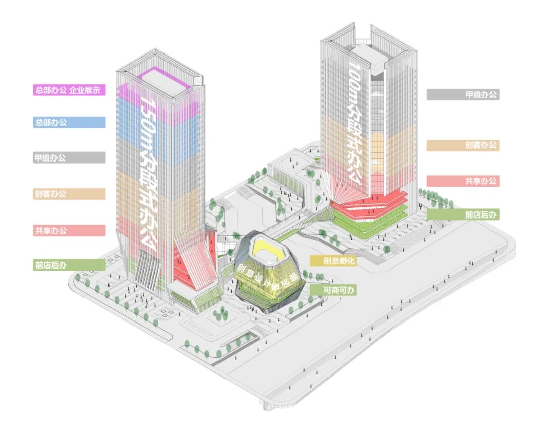 设计探索了现代办公功能组织模式及办公人员工作生活方式,遵循混合业态和弹性设计的原则,将商业、办公、展示、配套等功能有机地结合在了一起。