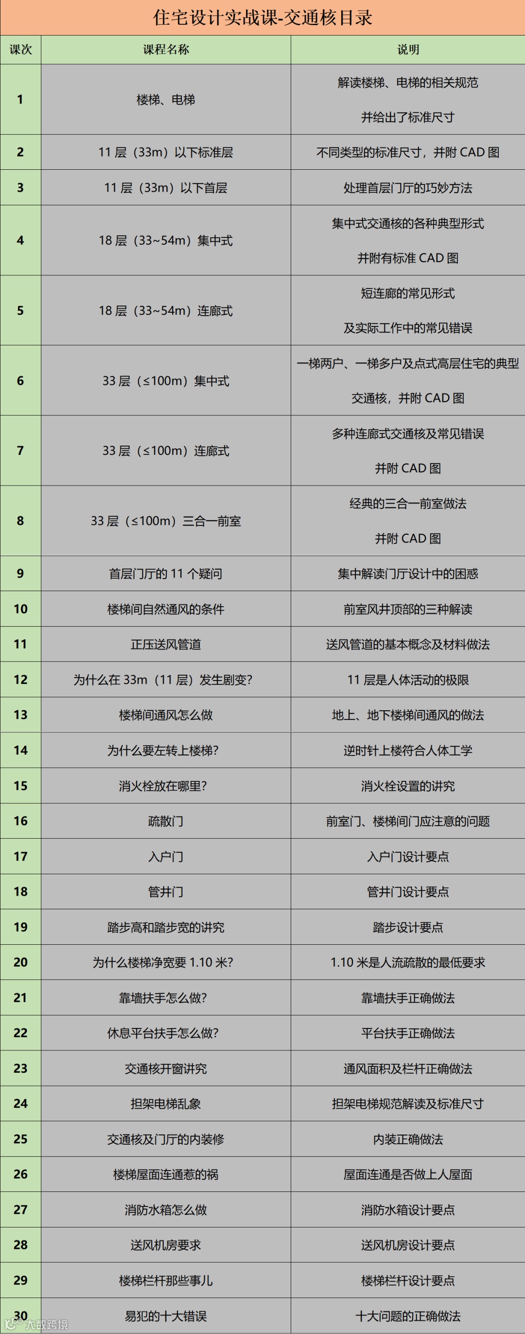 搜建筑及图图规范联合特别推出《住宅设计实战课---交通核必听30讲》视频课程。由搜建筑创始人郑新洪总结多年的一线设计工作经验,详细讲解了交通核设计的推演过程,并以各个类别标准模块完整呈现,让设计师快速了解交通核设计原理,轻松运用标准模块,提升设计师的专业性,并随课赠送标准交通核的CAD图,帮助设计师快、准、好的设计出优秀作品!