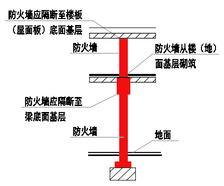 防火墙应从楼地面基层隔断至梁、楼板或屋面板的底面基层。当高层厂房(仓库)屋顶承重结构和屋面板的耐火极限低于1.00h,其他建筑屋顶承重结构和屋面板的耐火极限低于0.50h时,防火墙应高出屋面0.5m以上。