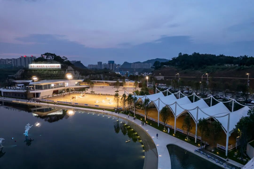 训练场被设置在主场地旁,仰头所见之处是绿意葱葱的群山,透过云层迸出光辉,饮马湖湖面反射出太阳余晖。通过充分尊重和利用场地中的自然元素,同时又恰到好处地进行人工干预,这个中心将成为一个既能满足马术运动的需求,又能促进人与自然和谐相处的理想场所。