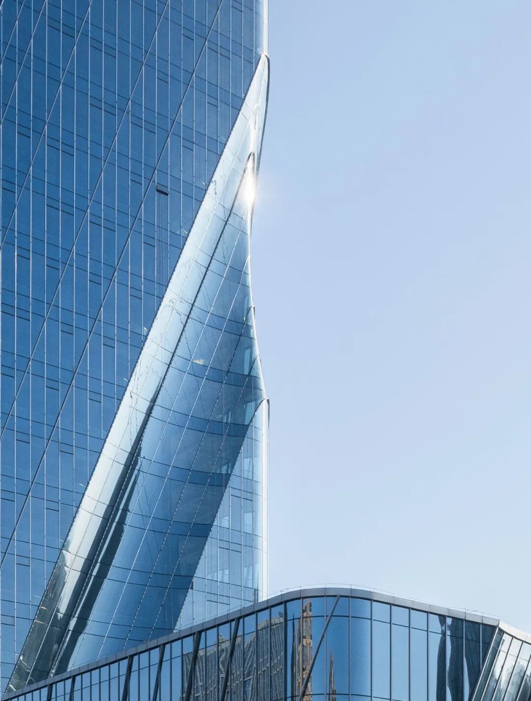 City reflection as part of the building. The ribbon-like concave mirrors embedded in the glass curtain wall embed the cityscape into the building's volume in a surreal manner, making the image an essential component of the building material. The architecture's form, imbued with a sense of speed, overlays the artificially transformed city reflection, reinforcing the urban attributes of this architectural language on both a material and abstract level.