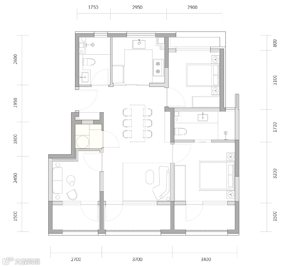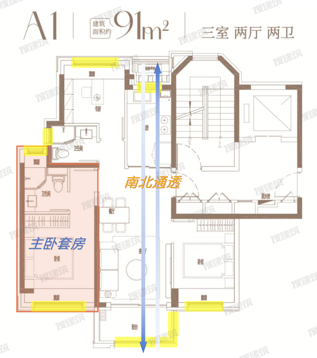双朝南卧室带飘窗,北向次卧带飘窗,两个卫生间,还有一个U型厨房。这样的空间控制功力,还能满足舒适度