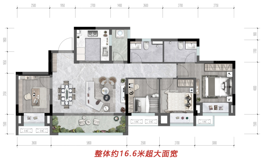 重庆中建启宸建筑面积约99㎡户型,4房2厅3卫的格局,采光通透,空间布局方正合理,预留充足收纳空间。整体做到了约16.6米超大面宽,竟然达到了6开间,在空间上实现了更舒适的尺度,将采光面、景观面充分调和。而且还是全明户型,附带独立的家政间。