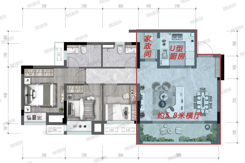 一体化横厅设计可能会占用一定的室内空间,但是带来的居住体验是一般户型不能比拟的。整个户型做了LDKG一体化设计,约5.8米的大横厅,与U型厨房、家政间、阳台完美地形成聚合空间。