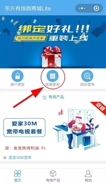 2.在商城首页,点击“账单查询”。(若页面提示未绑定,则点击“去绑定”执行上文中“微信商城绑定步骤”的操作即可。)