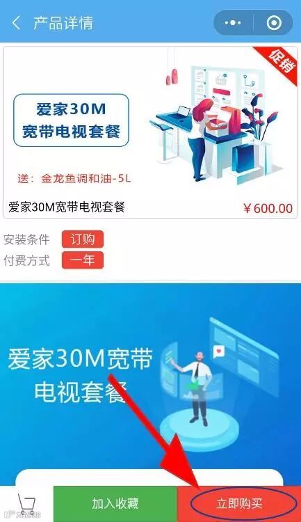 4.点击套餐图片,进入购买页面后,点击立即购买。(若页面提示未绑定,则点击“去绑定”执行上文中“微信商城绑定步骤”的操作即可。)