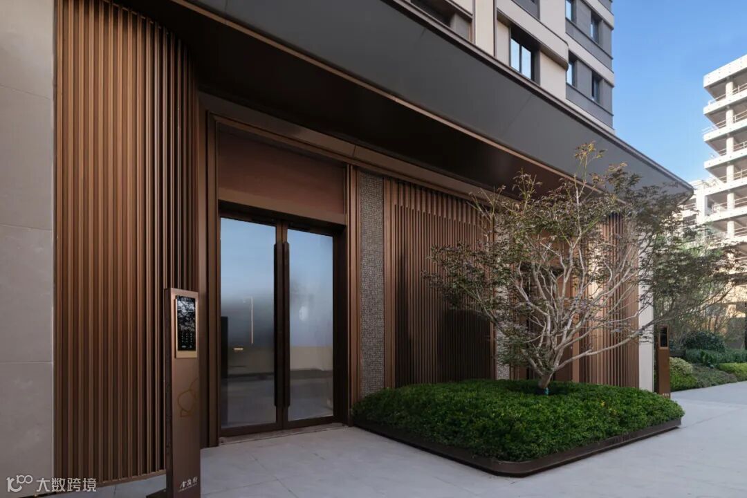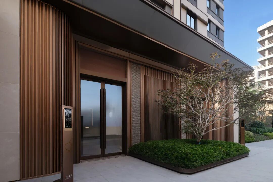 单元门头采用米白色干挂石材与“金茂金”铝板造型,用金属镶嵌勾边,着重刻画石材与金属质感对比的精致度,用极富变化的铝板金属造型,强调产品的价值感。基座采用石材和铝板结合,整体敦厚稳重,凸显品质,使得整体比例协调均衡,精致典雅时尚。圆润的造型取意“金元聚宝”,雅正大气中典藏细节匠心,礼遇业主的每一次回家!