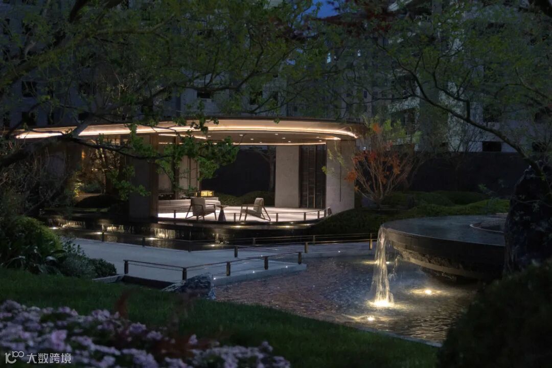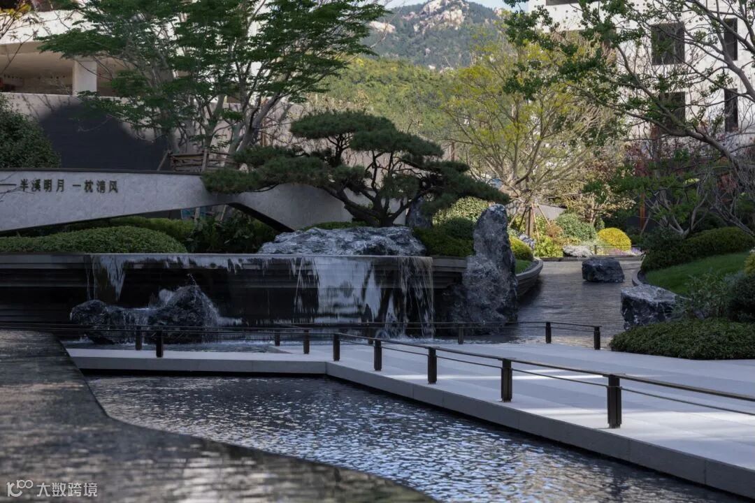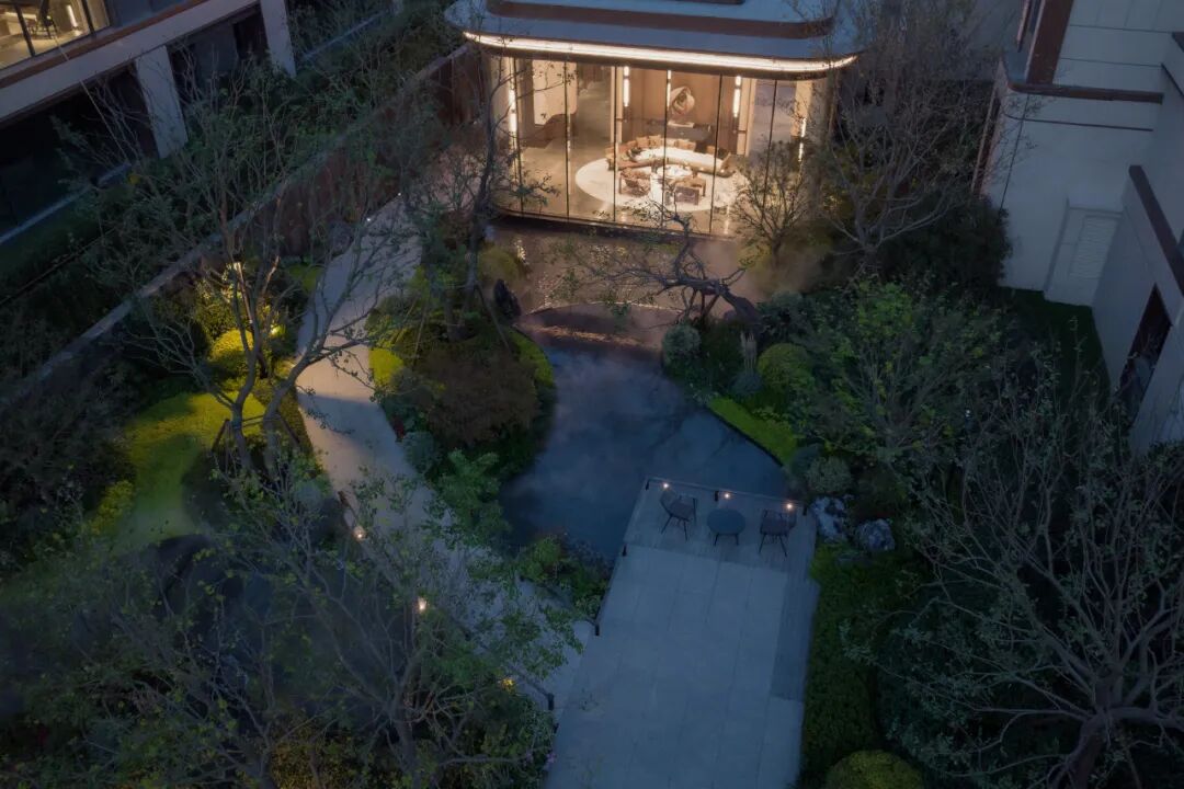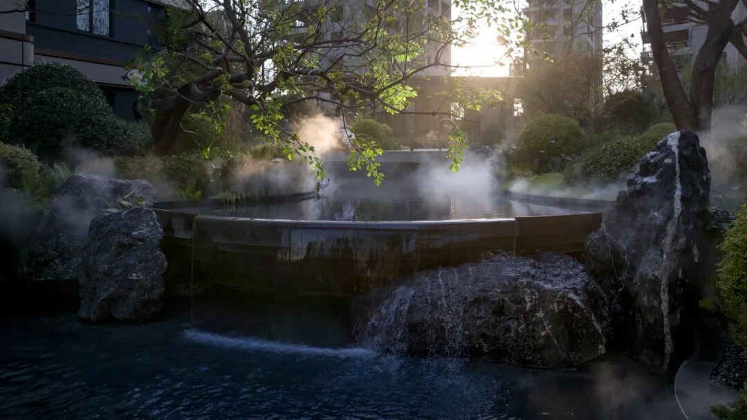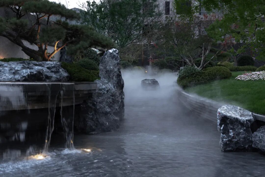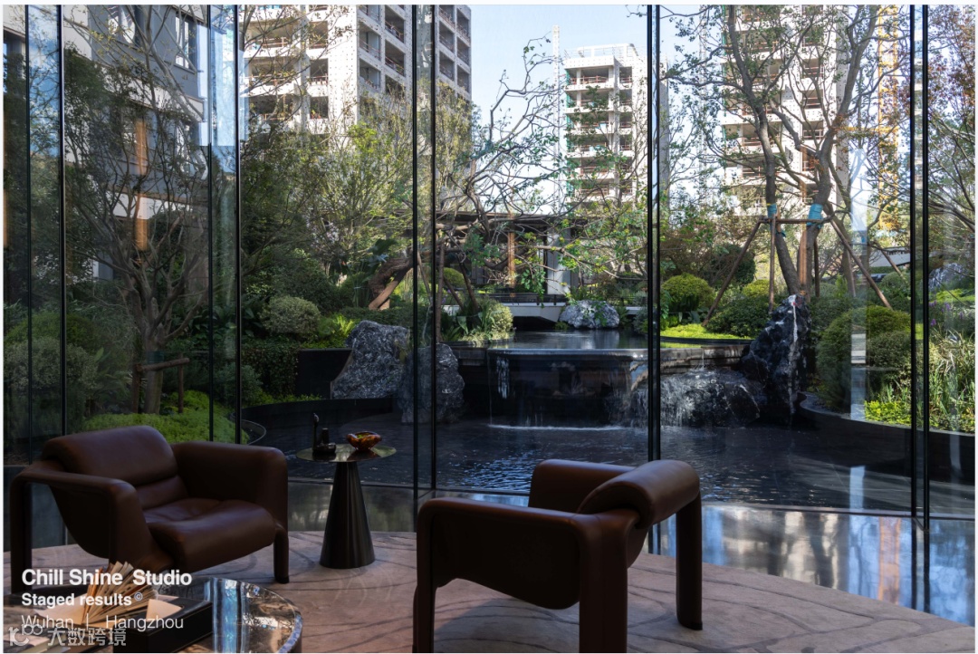 飞石流瀑掩映在树影之下,坐卧于会客区,听观水之流影,赏四季变幻之时。