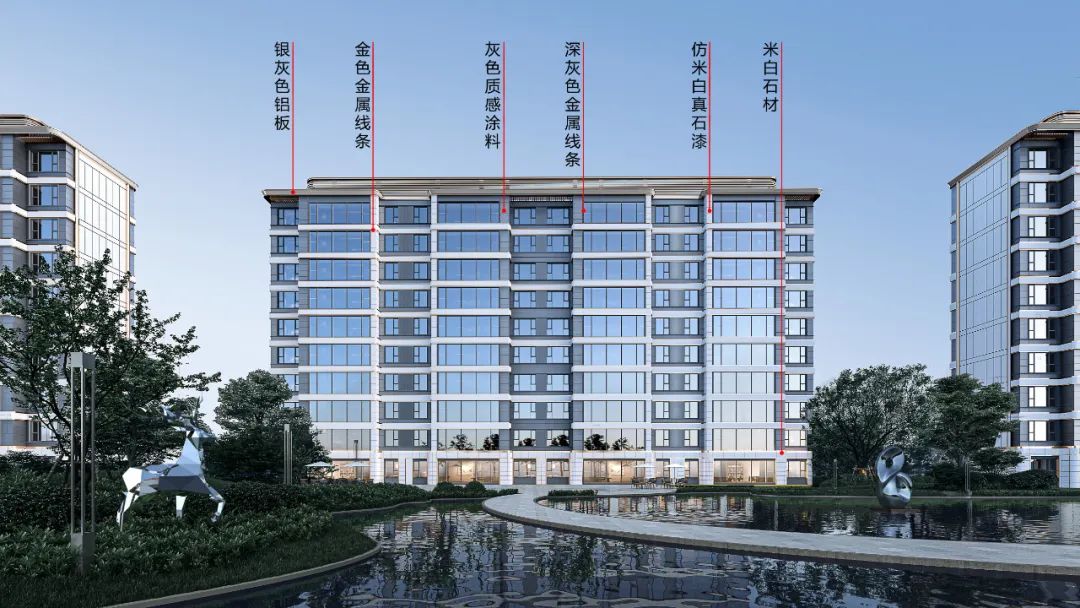 立面选材上,采用金属型材线脚、局部铝板石材、大面积通透玻璃塑造出干净纯粹充满未来感的立面效果,凸显建筑的品质感!