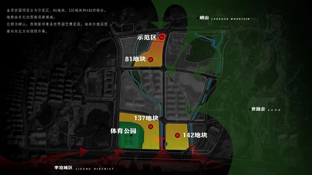 本案位于山东省青岛市李沧区世界园艺博览园板块,距离世博园500米,距离李沧区政府7.3公里,基地周边有百果山森林公园、百花园、山地园、双凤山及卧龙山,天水、地池、冲沟水系等山水景观资源,植被茂密,自然生态本底良好,是追求品质生活,亲近自然的雅居胜地。