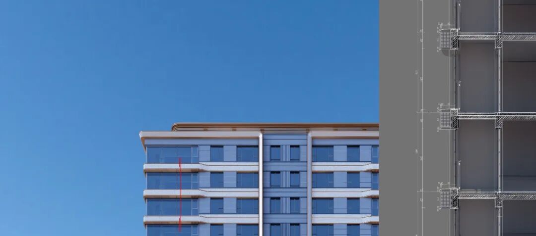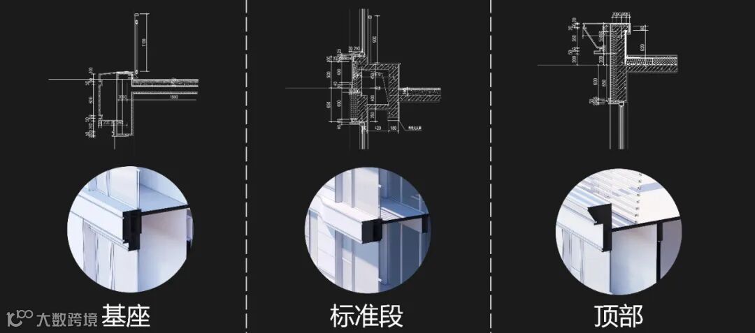 为了使作品以较高的还原度呈现,将幕墙节点图进行了精细化模型推敲,从细部尺寸,分缝划分,构建衔接等方面着手,尽可能多的减少隐蔽性影响因素的存在,以保证作品的精准落地。