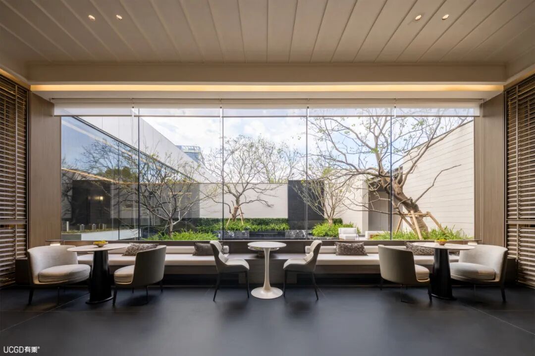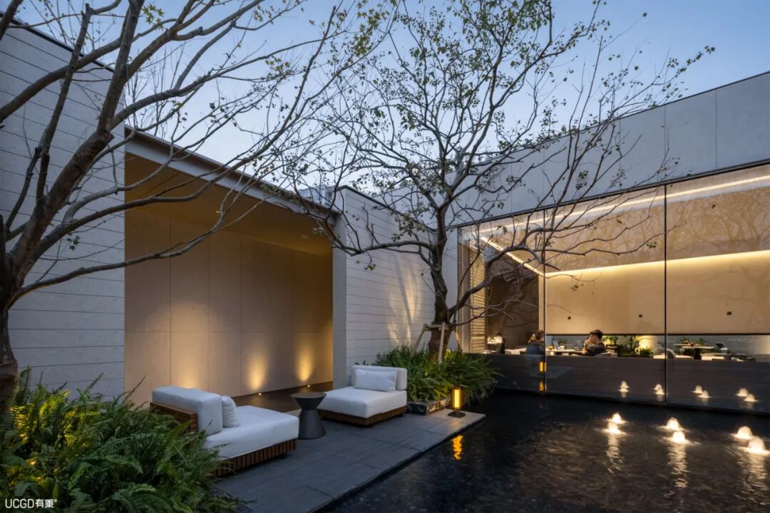 第三个庭院,游园视线聚焦在这四方天井之中,结合大面积玻璃幕墙,让建筑与自然的界限消解,创造出度假的静谧氛围。