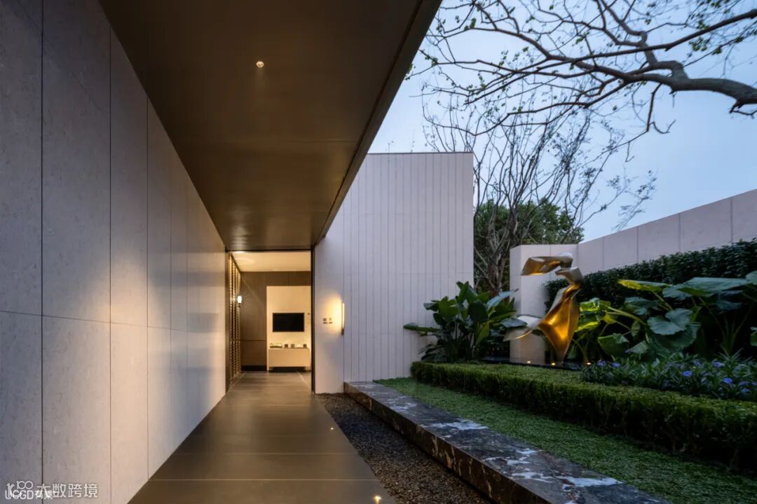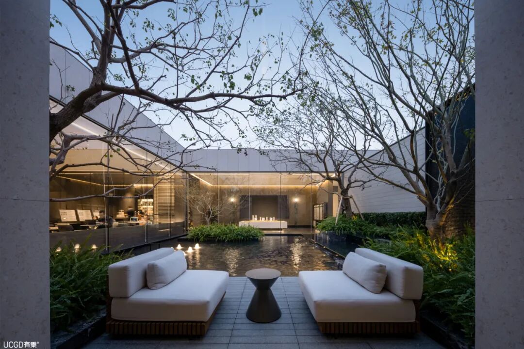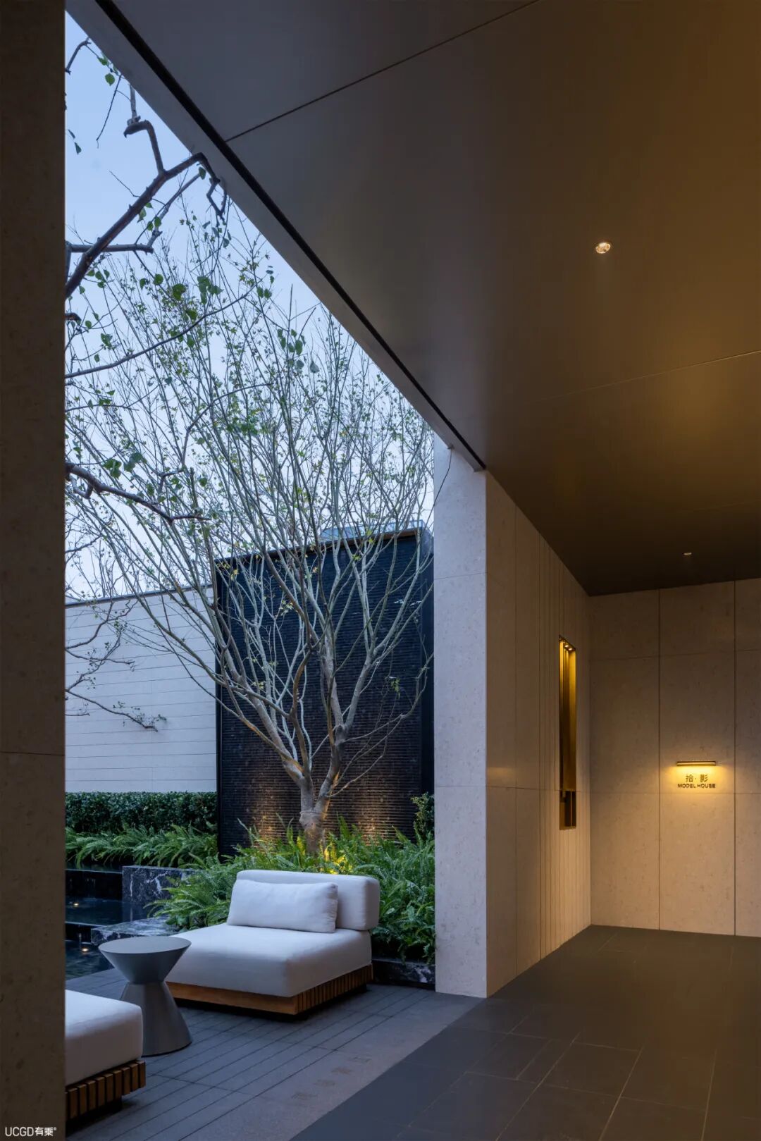 穿过接待前厅进入静心庭院。墙面围合,形成安静隔绝却又开放的私密空间。第二个庭院以动中有静、移步换景的苏式游园场景来布置空间格局。庭院、叠水、奢石、坐凳共同组合而成一个纯粹又自然的度假感现代庭园。