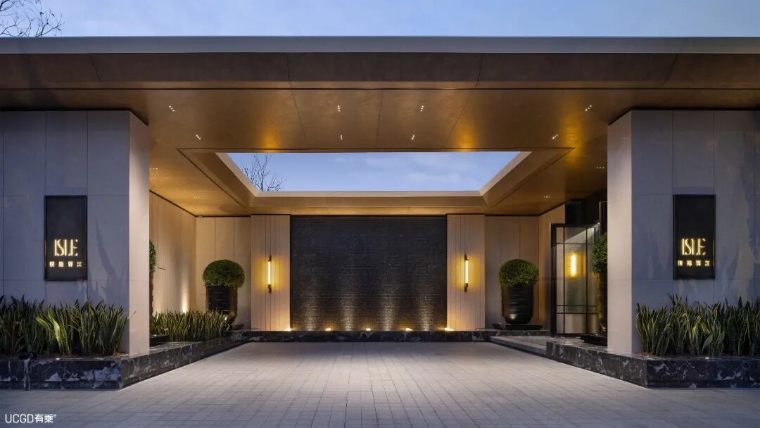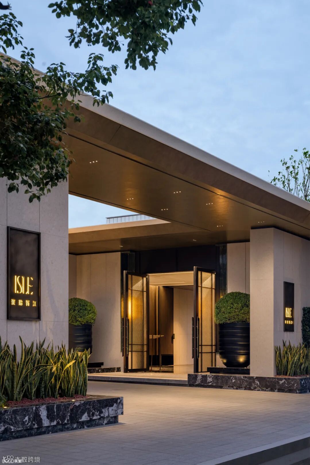 入口前庭是度假式生活的起点。璞拾胥江入口处的转角景墙仿佛一卷画卷,把嘈杂与喧嚣隔绝在外,营造出了尊享街区的领域氛围。第一个入口庭院引入了天光,将四方前庭打造成奢华又隐秘的酒店式入口。
