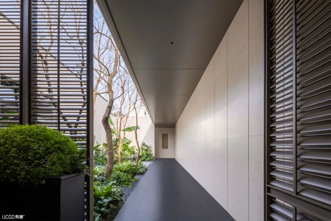 最后一个廊道小院抛开了厚重与复杂的设计,璞拾胥江延续“拾系”作品的白加金色调,融合自然的绿色和天光,打造出简洁又不失美感的建筑空间。 一条绿荫长廊,营造曲径通幽之效。公共与私密相连,直达样板间区域。