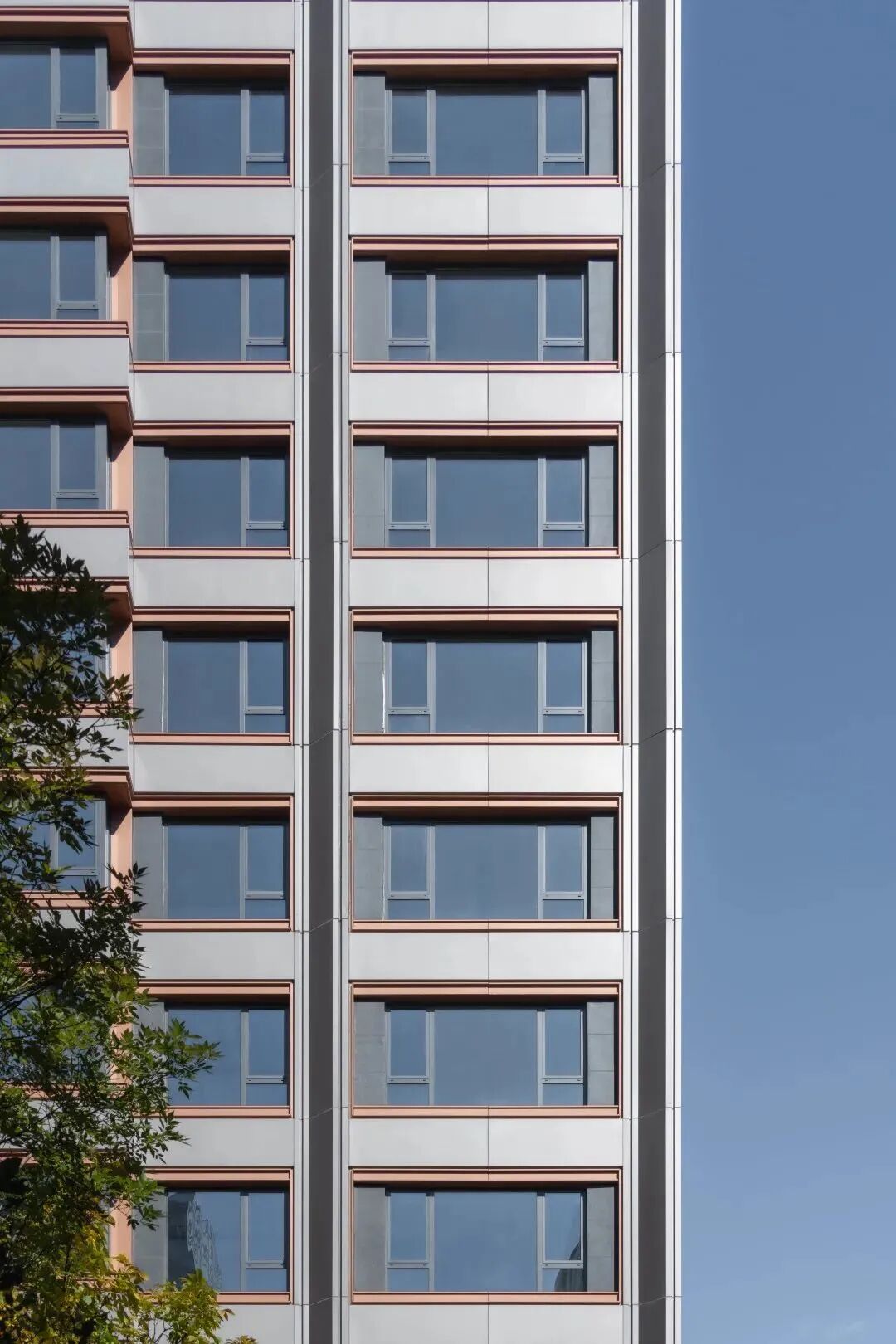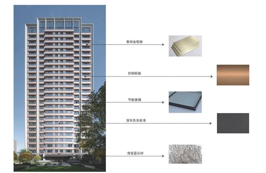 通过铝板的竖向设计以及水平线条丰富了立面的立体感。高层住宅二层以上部分使用香槟金铝板结合仿铜金属窗框,门窗玻璃采用双层中空节能玻璃。造型轻盈的香槟金铝板,防水、防污、耐腐蚀性良好,持久长新。