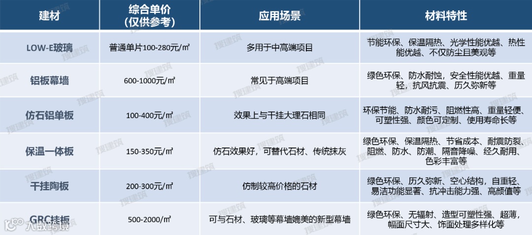 一是成本比较高的干挂体系(选材以玻璃、石材、铝板、仿石类为主)
