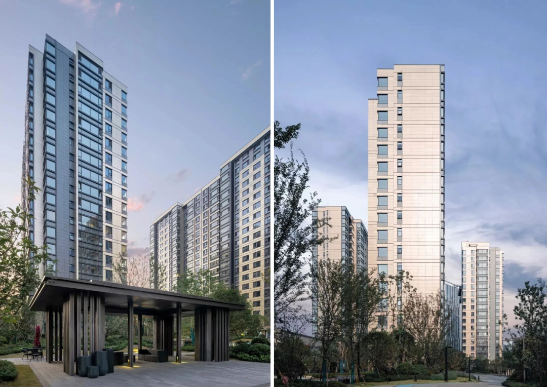 比如杭州大家绿城金麟府建筑主体采用辊涂印刷的仿石铝单板干挂。宁波天阳·永丰天第基座以上同样也是仿石辊涂铝单板,可以假乱真的仿石铝单板,石材质感增添了建筑的细节表达和价值感,同时也保证了建筑的整体性。