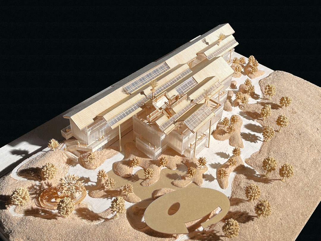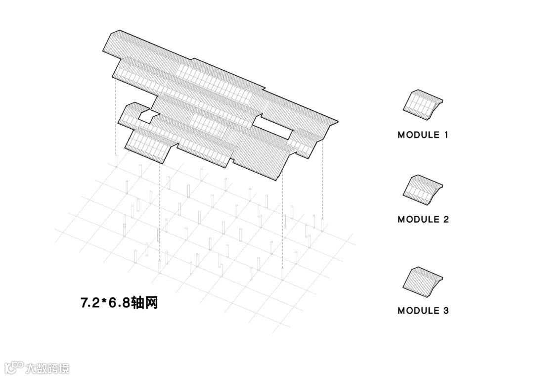 屋顶的结构体系,是根据7.2*6.8m轴网,用单元式屋顶模块组合而成,屋顶模块共有3种,通过不同模块的拼合以控制室外阳光通量,从而达到一个舒适的环境照明。