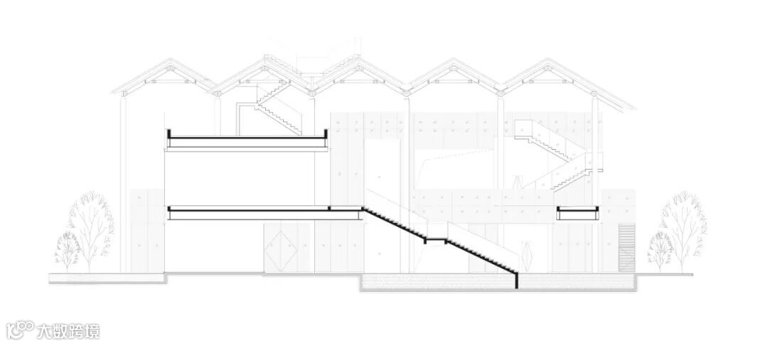 中庭空间通过台阶剧场进行空间组织,台阶上设置休息平台,在功能上赋予了台阶剧场更多的可能性,它可以是展厅、可以是剧场、可以是图书馆、可以是咖啡厅等。一切因需求而定,空间由此而再生。