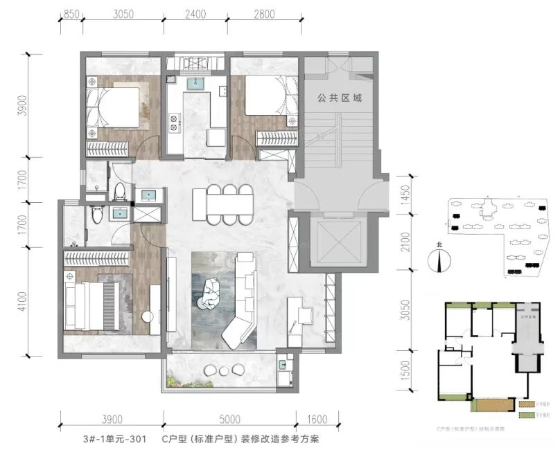 该户型在室内整体做了动静分区,保证了主人家生活的隐私,可在一定程度上降低动区生活对主卧休息的干扰。