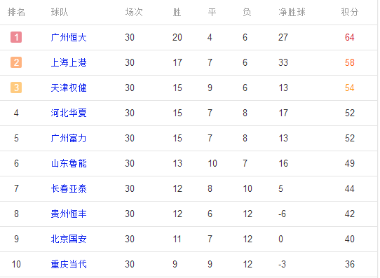 积分榜上,排名前四的广州恒大淘宝、上海上港、天津权健和河北华夏幸福,分别是2010、2013、2017和2016赛季的中超新军;而在另一端,北京中赫国安、上海绿地申花、江苏苏宁(原江苏顺舜天)和天津亿利(原天津泰达)这些熟悉的名字却赫赫在列。