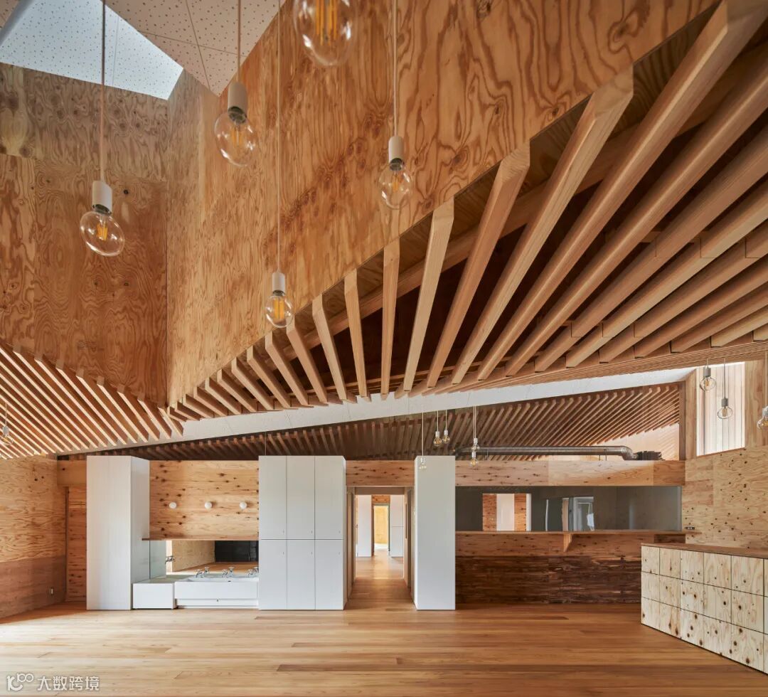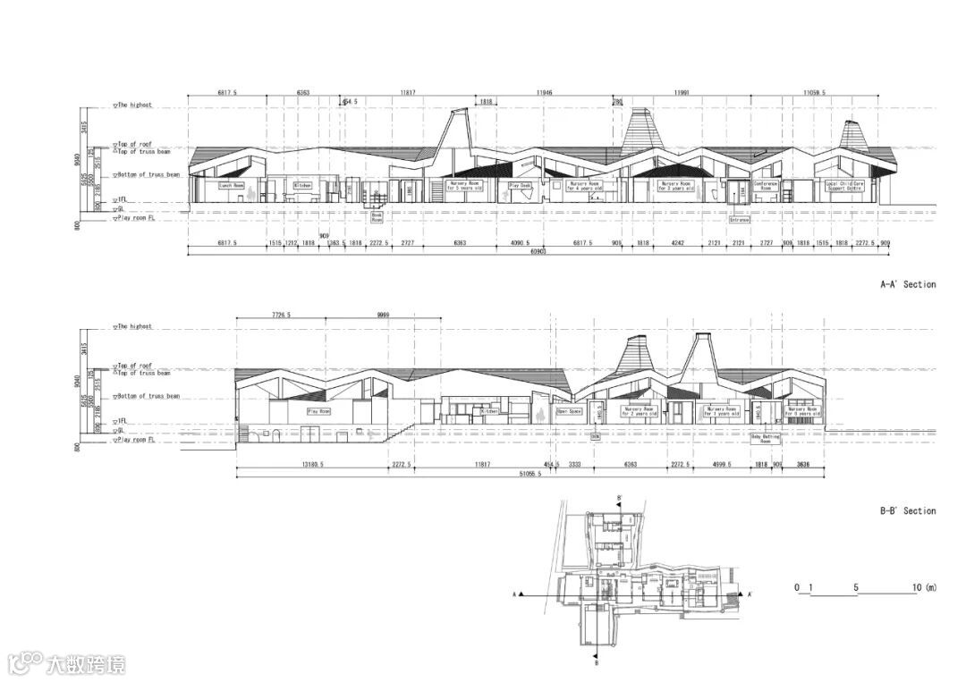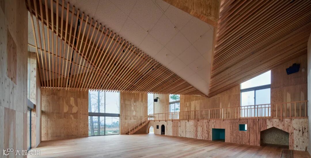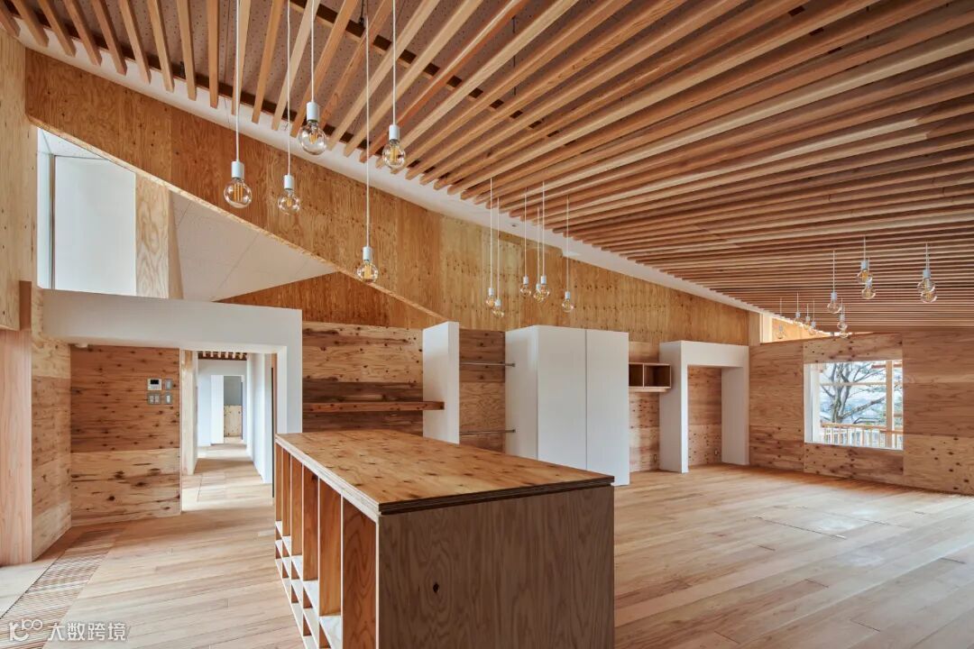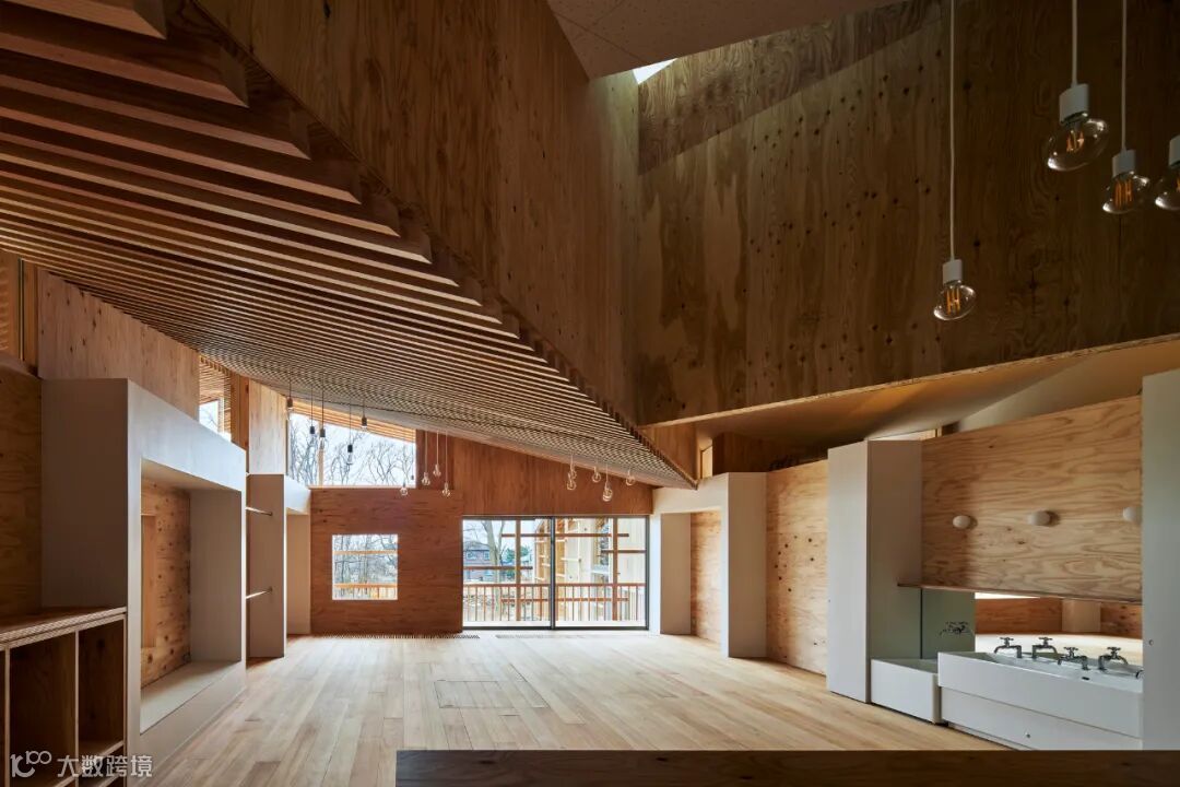 在现场条件下,大型木材无法运输,因此只能在现场搭建木桁架,将小型木材组合在一起,形成大型的苗圃空间。顶点朝上和朝下的桁架组合成一系列桁架屋顶。将桁架的交叉点从隔墙的顶部移开,使每个房间的环境更具表现力,而隔墙上方的开放空间则给人一种连接感。
