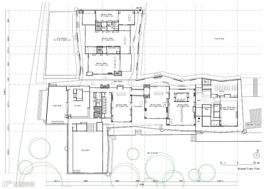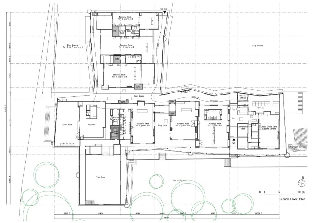 此外,还在县级杉木地板下安装了空调和全热交换器,形成了一个地板下气室,这样孩子们就不会直接暴露在气流中,而是通过辐射热作用于身体,为学习和游戏创造了舒适的条件。自幼儿园开园以来,随着时间的推移,在场地横断面布局流动性的鼓励下,孩子们在不同年龄组之间的社交活动越来越多。此外,随着孩子们在户外活动时间的增加,前来观看他们的老年人也越来越多。