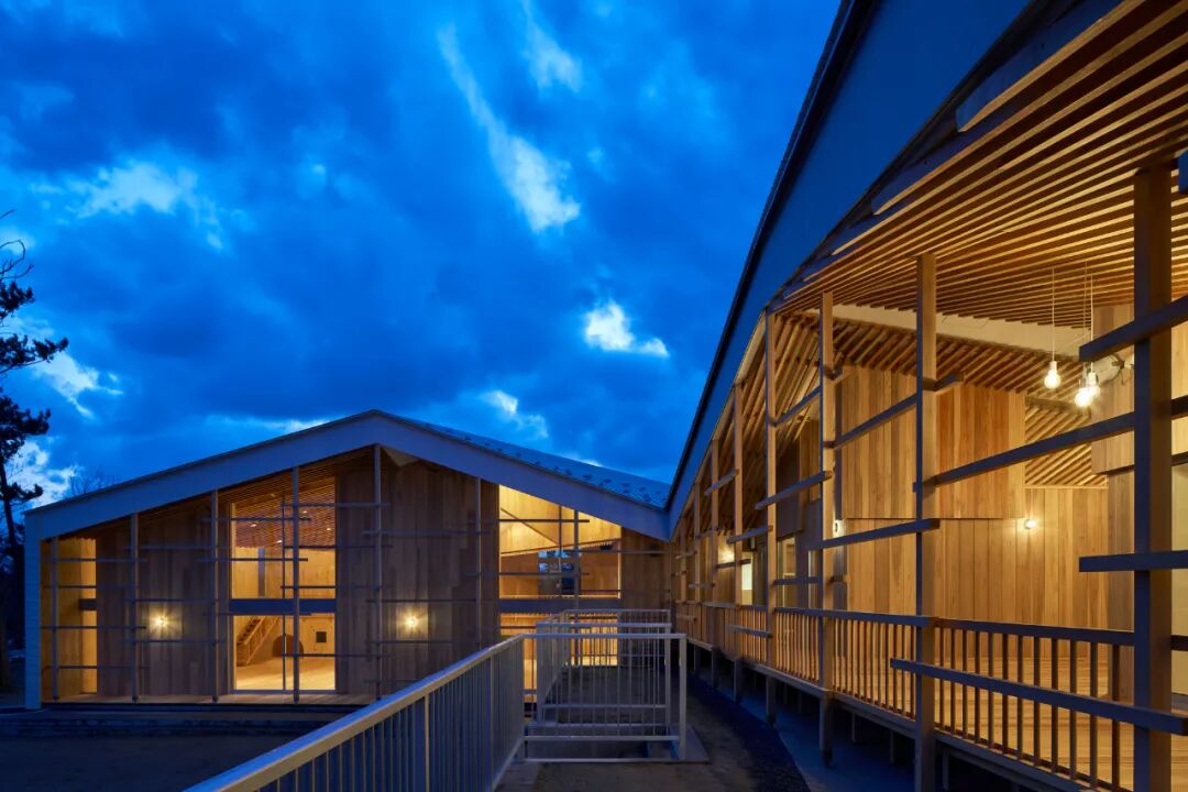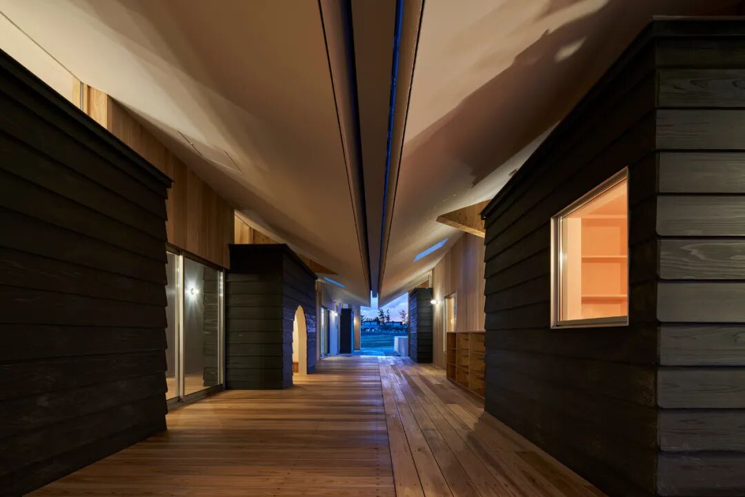 The Center for Early Childhood Education and Care (nursery school) aims to achieve the principles of engaging “naturally with nature”. Located at the end of a winding pathway atop of a sand dune, this single-story wooden building provides a diverse base for children filled with characterful rooms and recesses. The "construction of a large childcare environment" that extends beyond the nursery rooms, the building, and the nursery yard to the surrounding area as a single continuum, and the "establishment of a mutually watchful relationship” in which the whole village is a part of there for the children's learning and play, and while the children revitalize the village. That is what was aimed for.